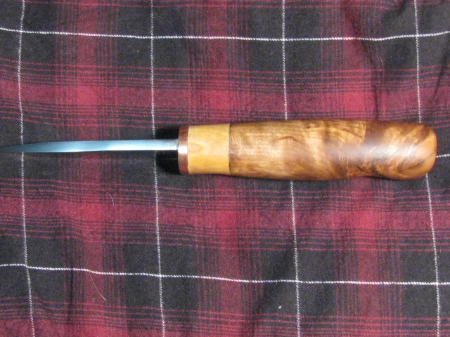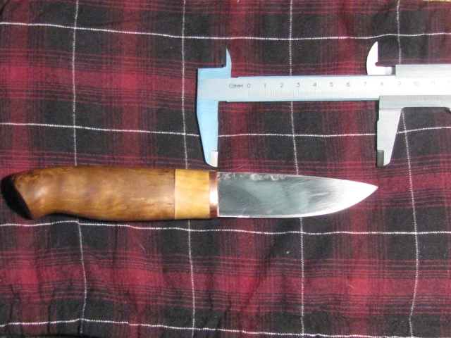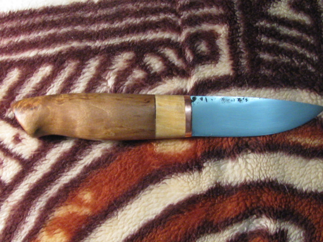 Здравствуйте дорогие сопалатники! Вот наваял нож, решено назвать "Метис". ТТХ: клинок кованая Х12МФ от Bambr11, 95х27х5мм, клин почти от обуха, пока не заточен. Больстер: медь 5мм/тонкая береста/сушеная сувель березы/тонкая береста/ХБ ткань/вареная сувель. Рукоять 120мм. Монтаж всадной на эпоксидку с опилками. Клинок был подарен Bambr 11, и изначально приобрел рукоять из дуба (видно на фото).Рукоять не понравилась, решил переделать. Изначально,при рождении, клинок после слесарки был сильно царапан, около месяца шлифовал его в перерывах на работе, стал конечно поглаже, буду совершенствовать... Хвост в процессе ТО был сломан, поэтому был нарощен при монтаже медной трубкой. Ножны будут. Обязательно... Фото конечно не очень (батарейки умерли слишком быстро). Вот вкратце и все. Ловлю мебель.