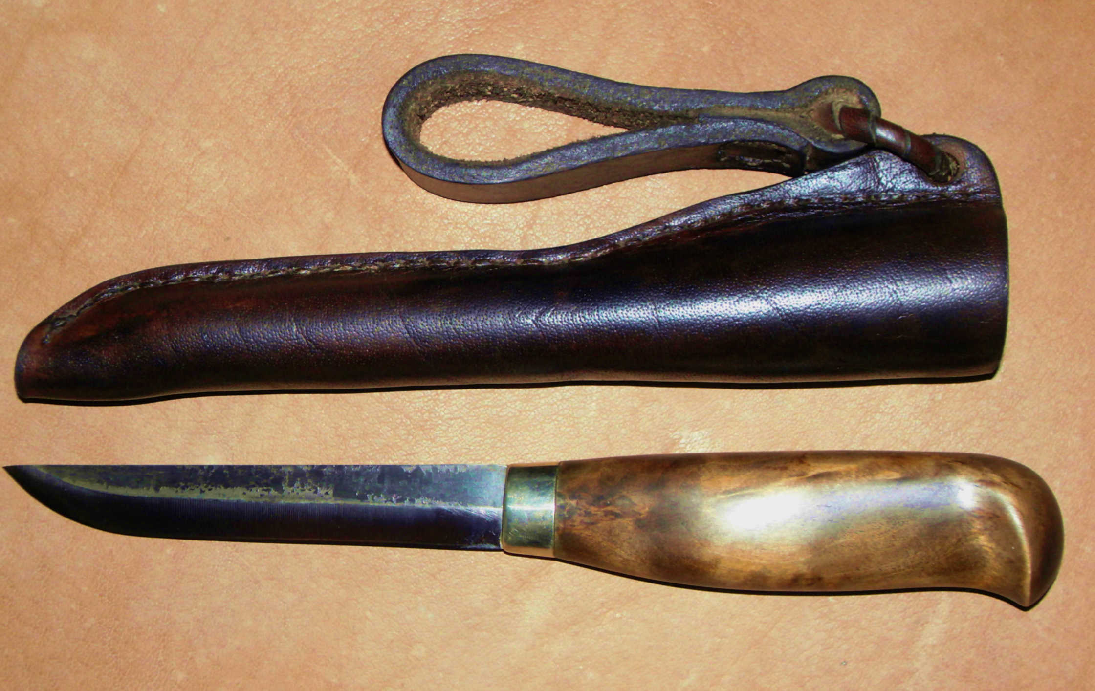 Клинок Лаури, доработан: пятнистый узорчик и оружейное воронение вместо окалины на голоменях, переспущена линия обуха (теперь клинок сужается к острию), слегка полирнул спуски. Монтаж решил сделать всадной, на 4/5 длины рукояти - поэтому слегка укоротил хвостовик и сделал на нём насечки. Клей - эпоксидка с наполнителем из наждачной крошки и деревянной пыли, схватывает атомно. Оковка - нейзильбер, рукоять - карельская берёза, тонирована неводной морилкой.