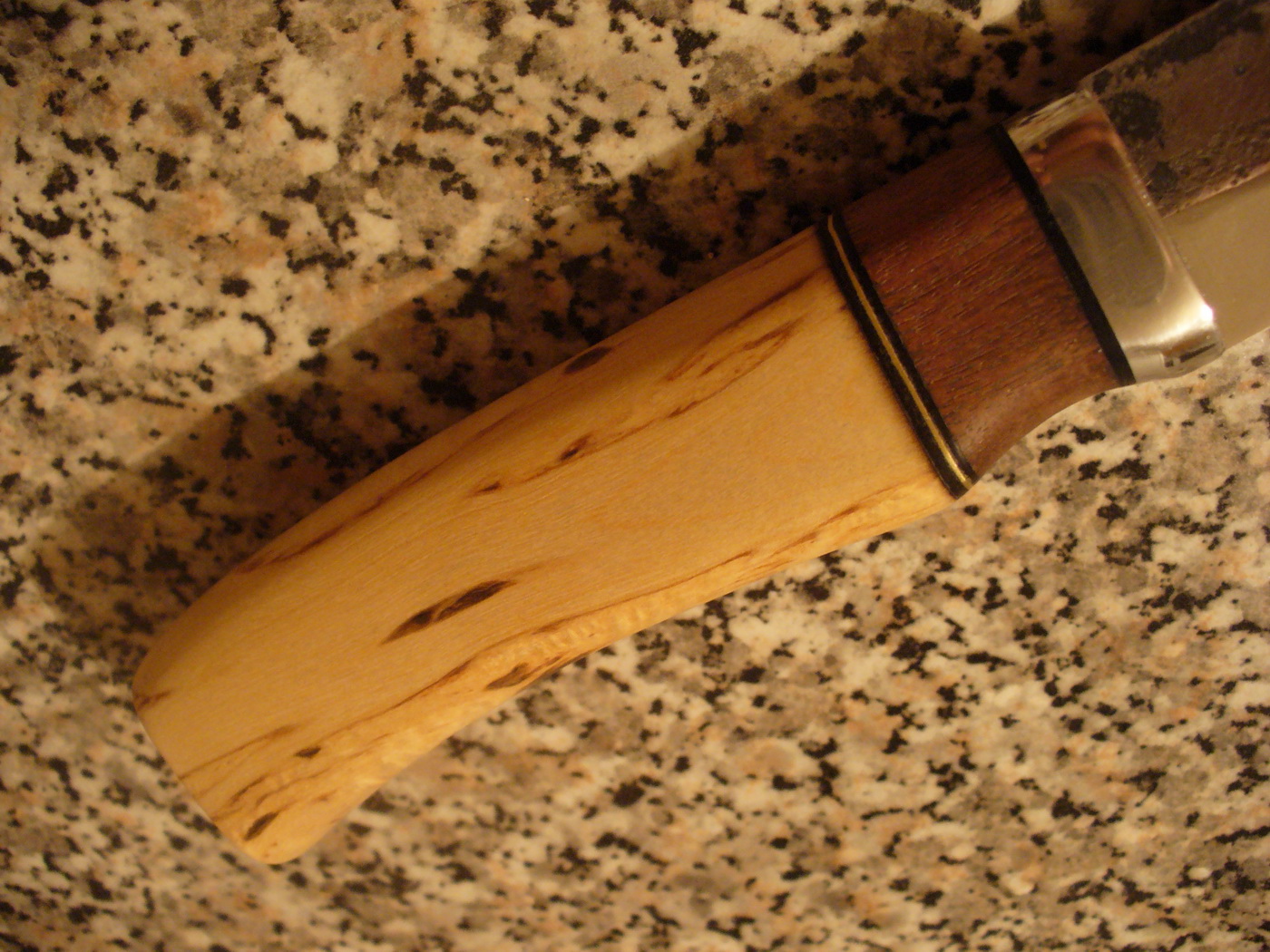 Нож интересный.Из того бруска нужно было одну рукоять делать а края оставлять на поставки :wink: и сучка бы не было.Еще березы надо?