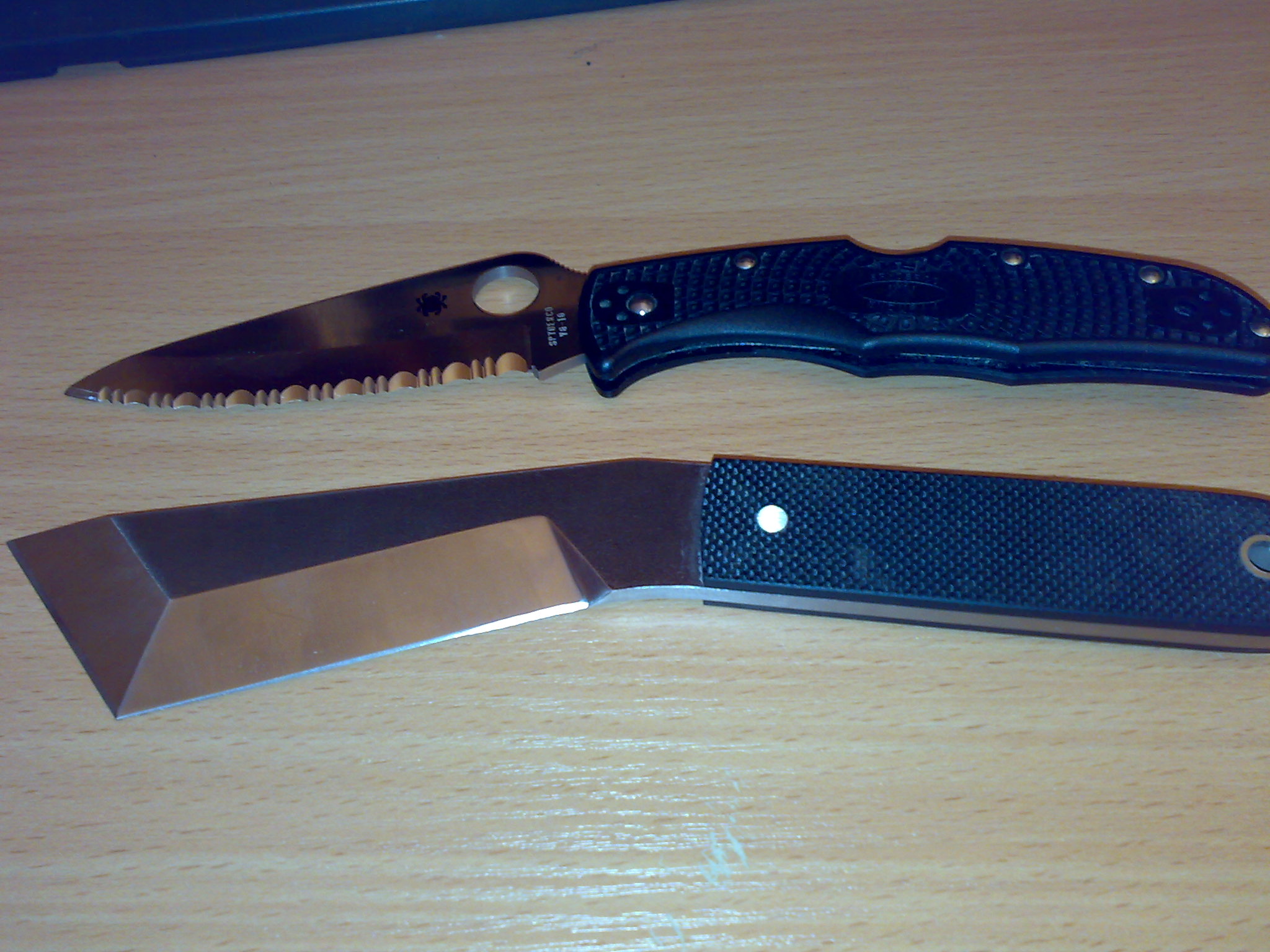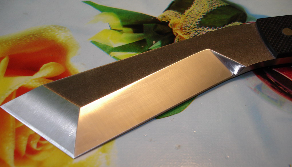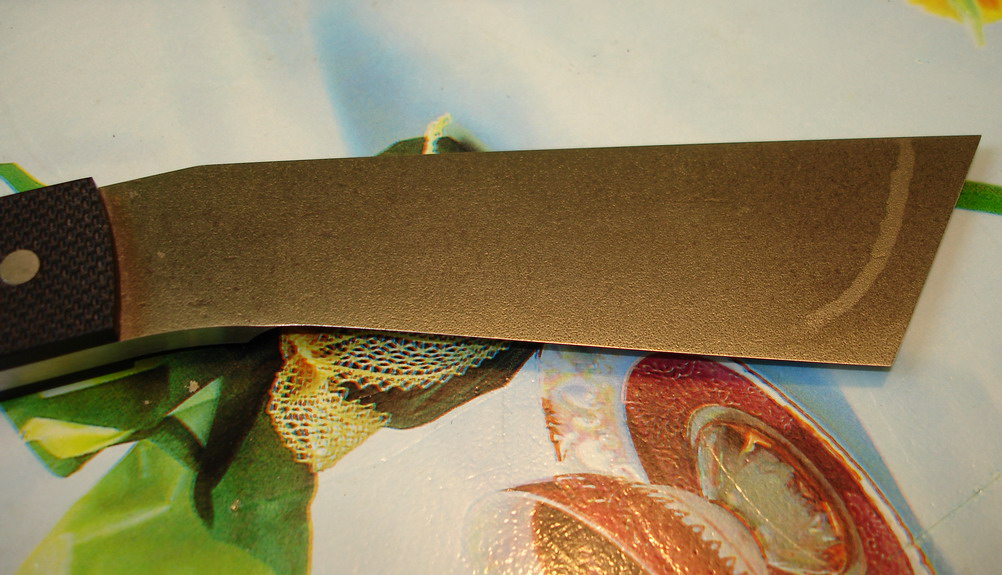 Я так понимаю, что он под левшу заточен. Отсюда неудобство с нарезкой. Вообще с таким углом и односторонней заточкой он должен очччень тоненько резать. Прикольный девайс. Техно-кукри. :lol: