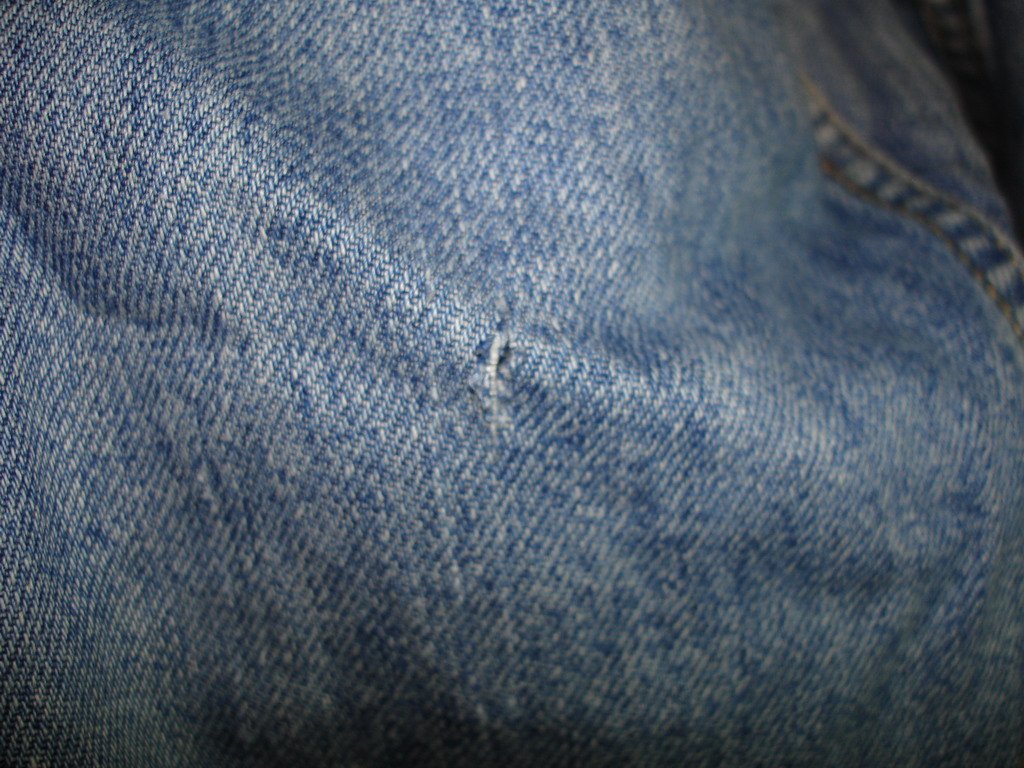 Все фото опять грузятся.Подвесил я джинсы жены за веревочку и попробовал их разрезать.Материал плотный,клубным грипом с пятого раза проделал маленькую дырочку только :?