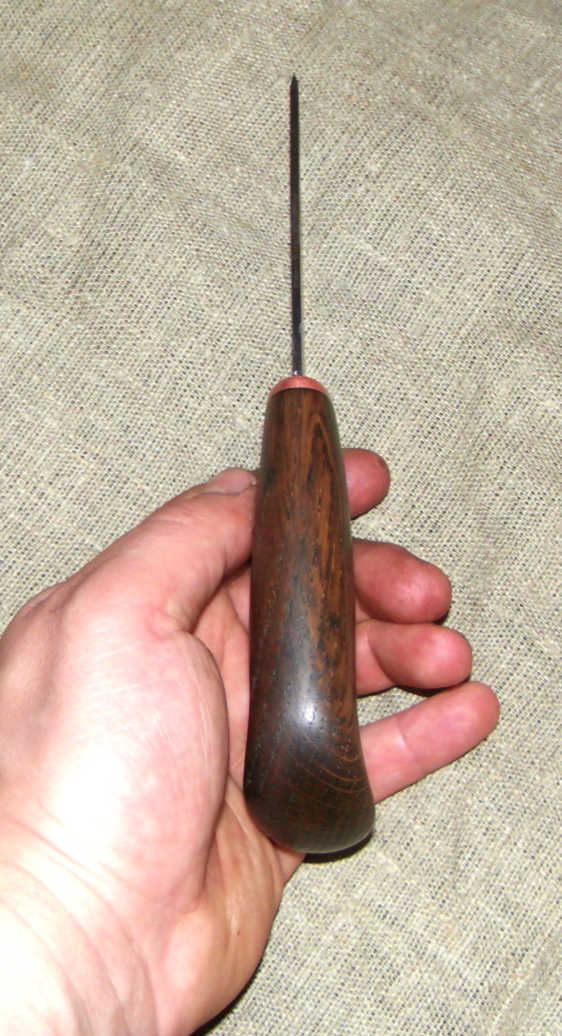 Работал я с морилкой по дереву. Не хочу, чтобы рукоять потемнела. Наоборот, хочу льнянкой текстуру оживить. Со временем дубок потемнеет от пользования всё равно.
