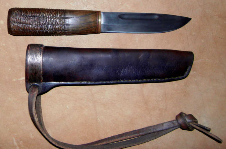 На рукояти я применил технику рустикации, подсмотренную у мастеров по курительным трубкам. Сперва делаются канавки (я делал гравировальной машинкой, бором), потом - долгая работа карщеткой. В первой трети рукояти резьбы нет - во избежание загрязнения. Ножны из толстой (6мм) кожи, с проставкой и медной полосой, травлёной под старину, в верхней части - для прочности. На фото не очень чувствуется, вобще же ощущение от ножа - "маленький меч", здоровущий, тяжелый и очень острый (оценил прелести односторонней заточки - легко доводится до бритвенной остроты). Рукоять длинная - у меня, например, ладонь охватывает только 2/3 всей длины; так что зимой и в рукавице будет очень удобно :)