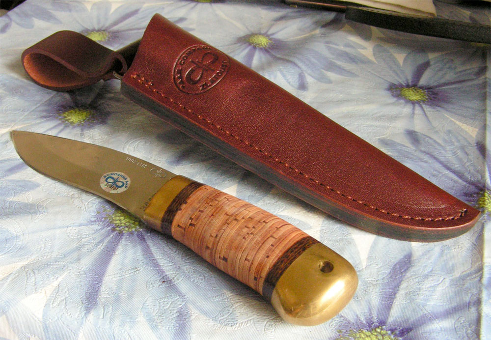 Как я писал выше, заказал Шаманчика для жены за грибами ходить. Для практичности взял из 100х13, береста и латунь. Финку взял в коже и латуни.