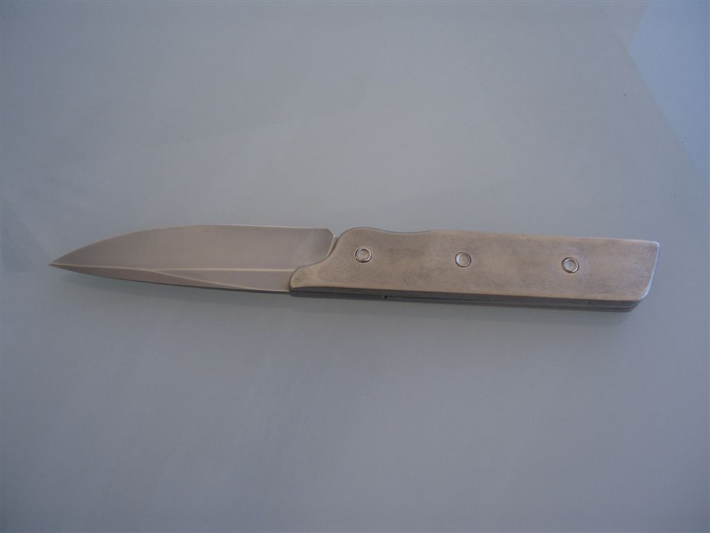 Понравился. Простой. Гармоничный. Ничего лишнего. Я б только полирнул торцы винтов с обеих сторон. Аркадий, а отверстие под шпенёк просто прикрыл и всё? А что если для дополнительной жесткости вставить штифт, расточив отверстия впотай изнутри накладок?