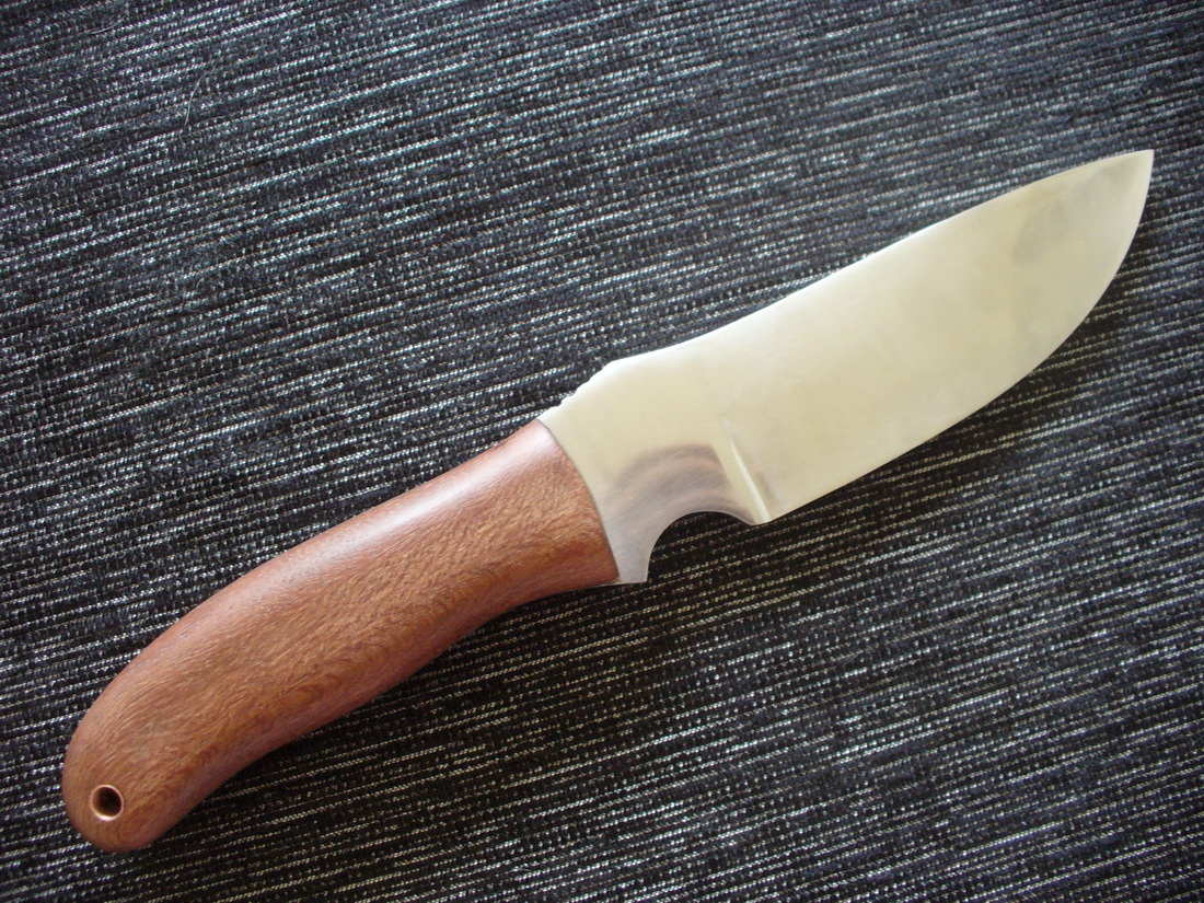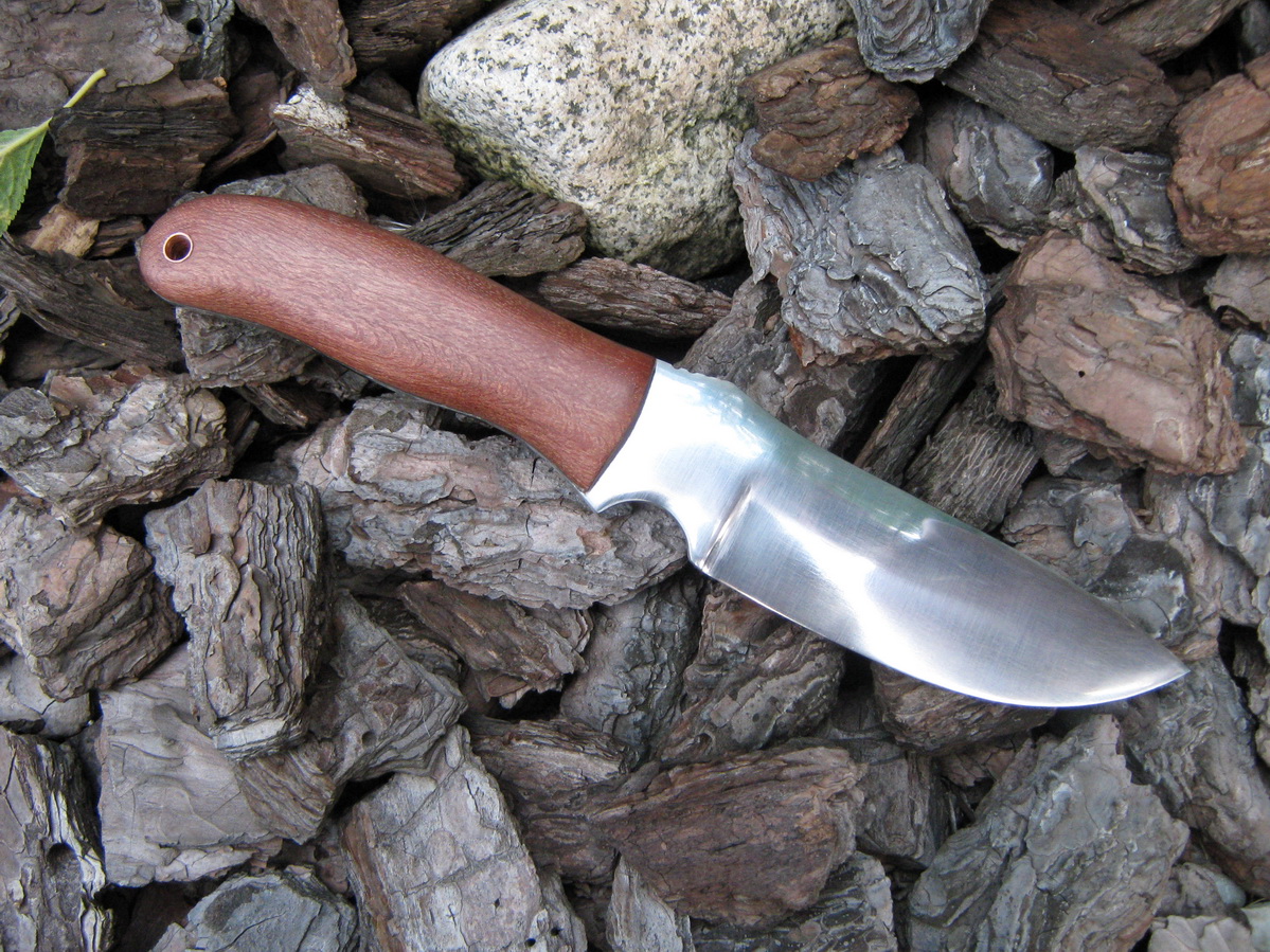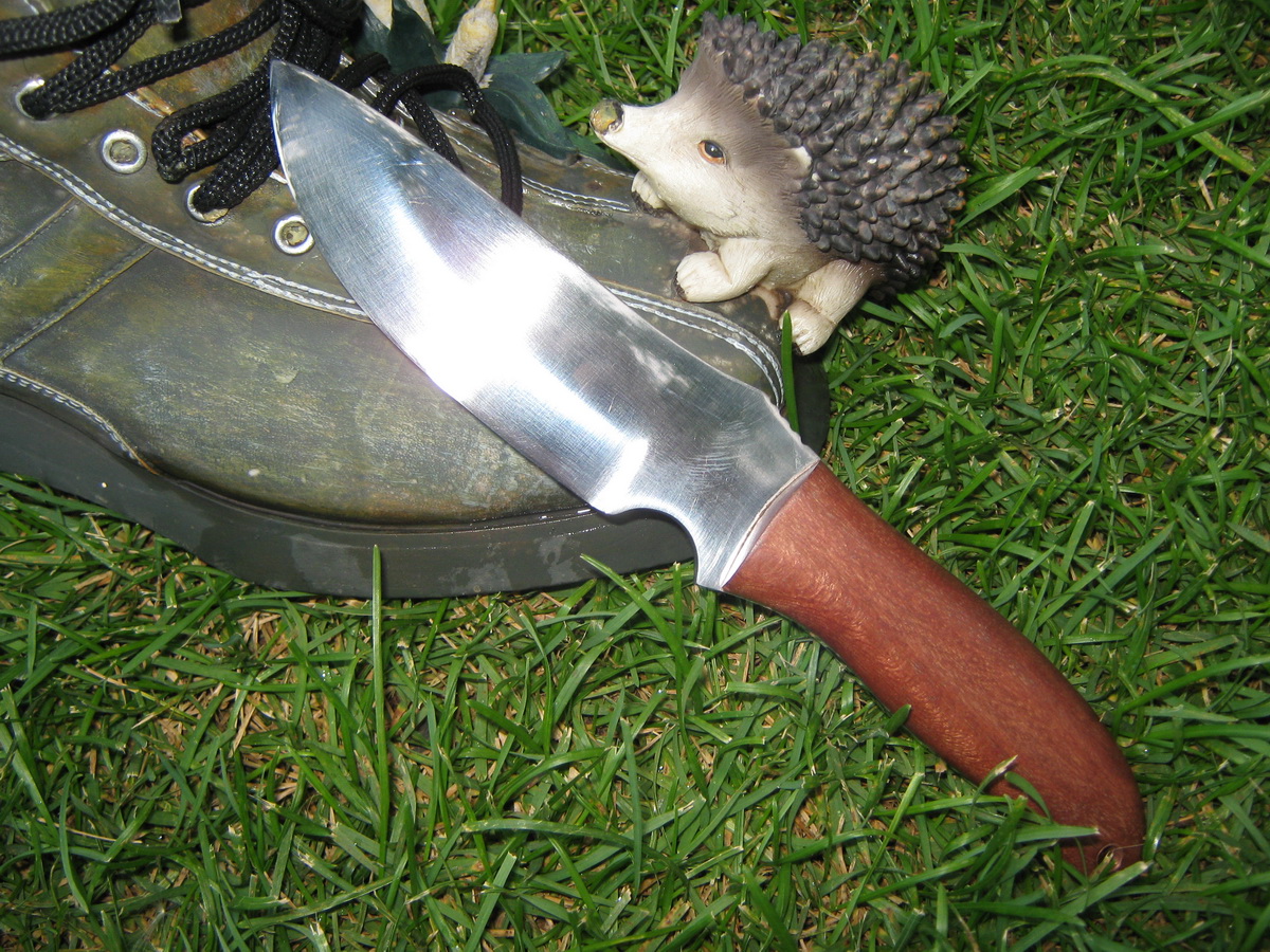 Сталь ШХ15. Рукоять неизвестное красное дерево. темлячное отверстие медная трубка. Накладной монтаж ручки по учению деда Димона.