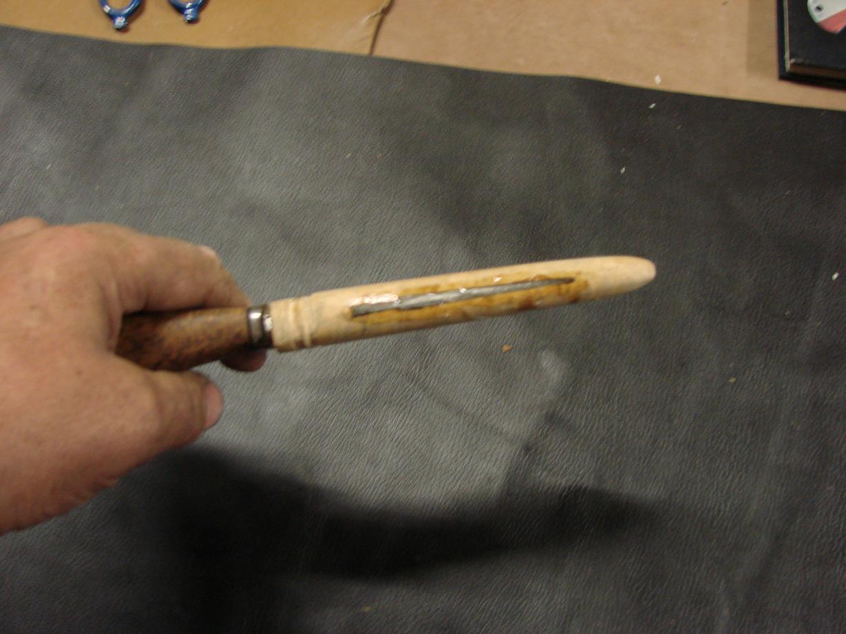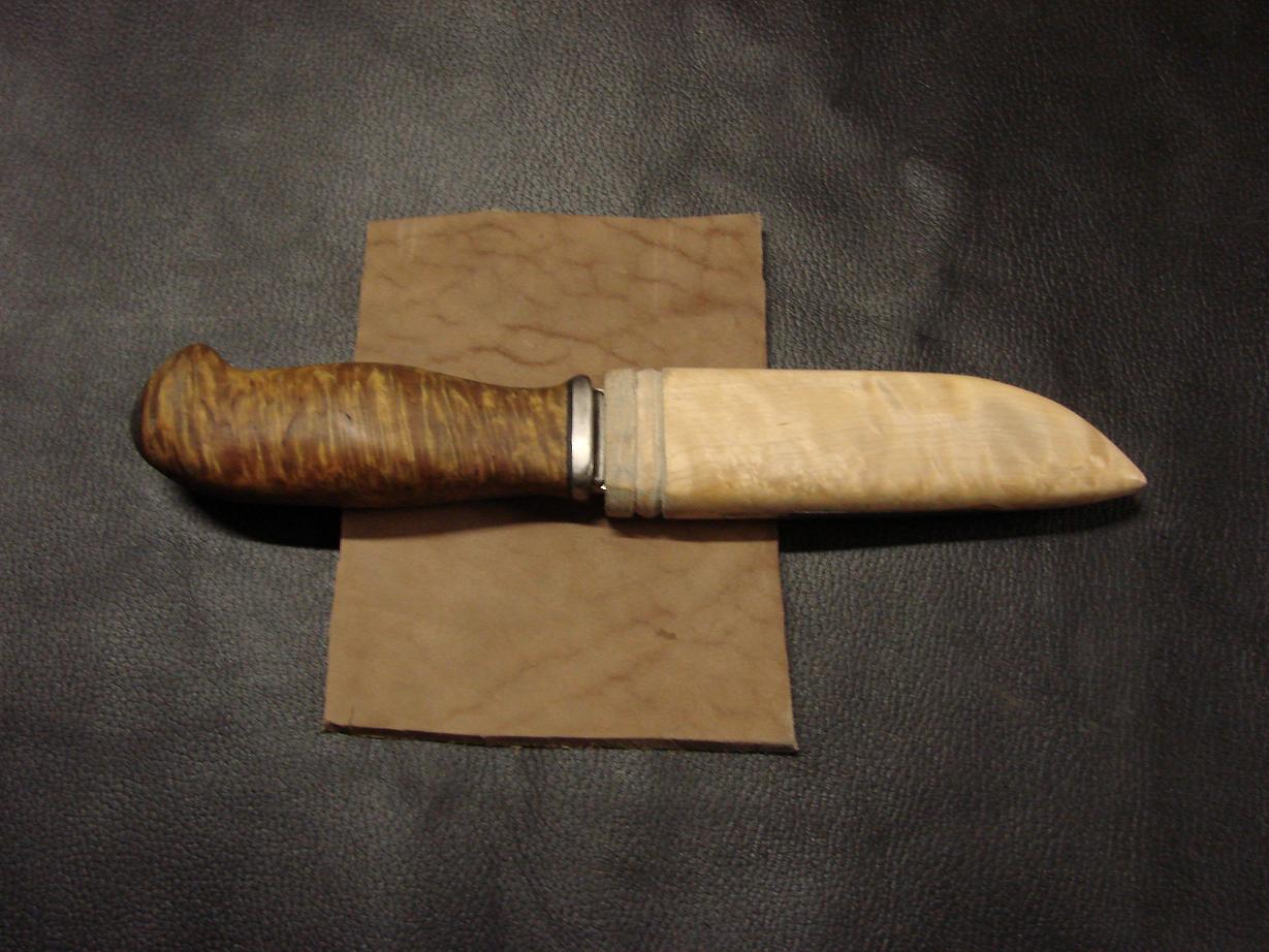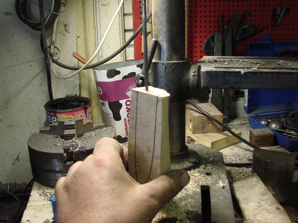 Привет всем! Зафоткал прцес изготовления совмещенных ножен(дерево = кожа)Вобще делают из двух половинок,но я чегото обленился :lol: Под конец работы в деревяхе вылезла щербина,вклеел железку и поехал бить уток (кожа завтра)