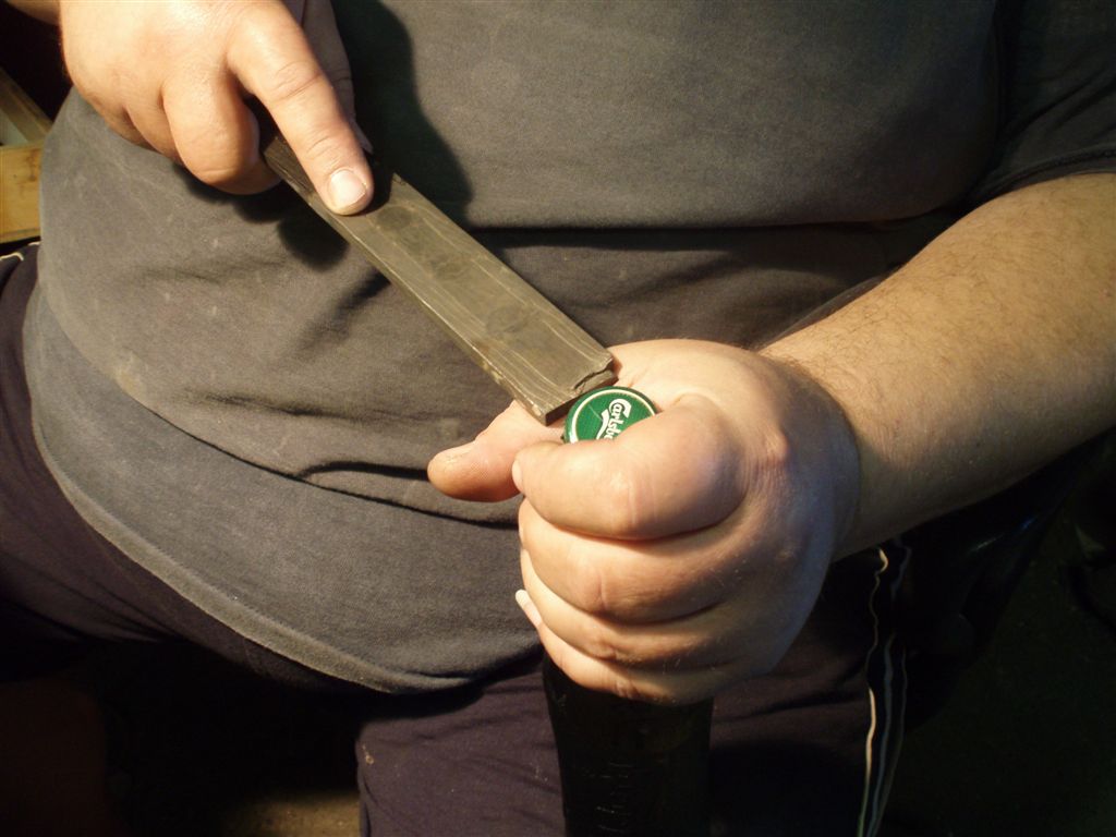 Руди открывает пиво полосой мозаичного дамаска собственного изготовления и мы начинаем рассматривать будущий НОЖ .