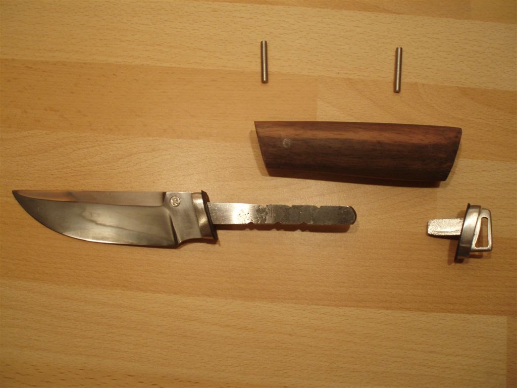 Что это дает ? Легче поймать соосность клинка и деревяшки , а второй конец я использую для монтажа навершия со скобой ( все титан , как и больстер ) для удобства вытаскивания ножа из ножен без темляка .
