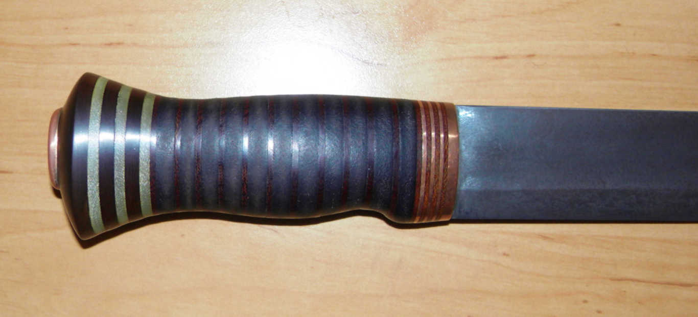 Рукоять - медь толстая и тонкая, текстолит, стеклотекстолит, гетинакс и кожа. Пластинки кожи проставлены тонкими текстолитовыми. Клинок - инструментальная сталь, травление под старину и оксидирование в ХЖ. Длина клинка158мм, толщина 4мм, ширина 36мм. Длина рукояти 125мм. Монтаж сквозной, раслёп на овальной медной шайбе + эпоксидка. Вес ножа без ножен - 400г.