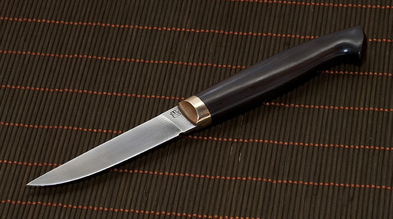 Название забыл спросить. Дамаск. Очень приятный маленький, удобный ножичек.