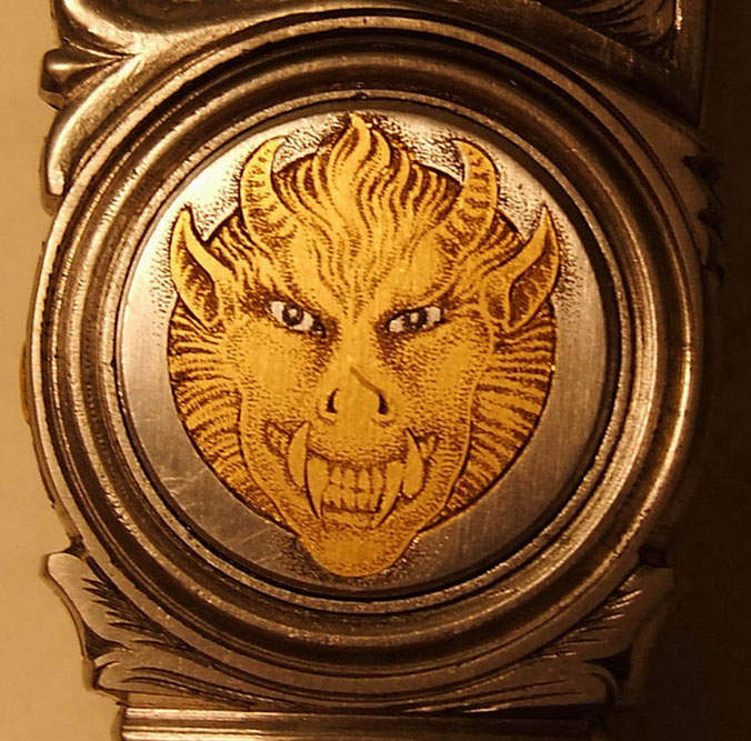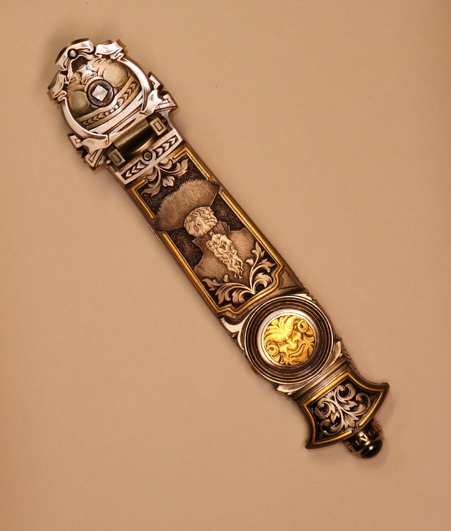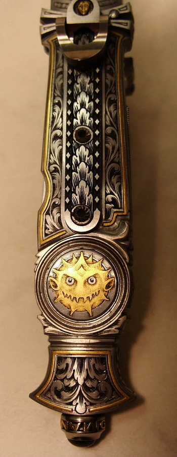 Нож имеет боковой выброс клинка. Работа выполнена в готическрм стиле. Много лет назад многие авториты из Нью-Йорка были заказчиками автора. Мастер обычно закладывает серию ножей из 7-8 штук опохожего дизайна и больше к нему не возвращается. Кольцо - это поинт-гард, символическая дань истории прошлого ножей. Он имел практический смысл. В средние века были развиты поединки на ХО и ножах. Клинки ножей и леворуких кинжалов зачастую снабжались кольцами рахнообразных видов и форм: одним, двумя, тремя и т.д.. Иногда в кольце была сетка. Кольцо не обязательно было круглой формы. Оно могло быть исполнено в виде ракушки со всевозможными зацепами, завитками, в которое могло попасть и застрять острие клинка противника. Человек, у которого клинок попал в такой захват терял секунды боя, чтобы высвободить оружие требовалось вытянуть его назад, а в это время противник наносил ему удар второй вооруженной рукой. Например на немецких леворуких кинжалах Caксонии были простые кольца прикрепленные к перекрестью кинжала. Гарды старинных шпаг и рапир также зачастую имели всевозможные формы с отверстиями в виде дырочек, проререзей, крестиков, имели зацепы. Подобный элемент оружия производил эффект и психологического устрашения на противника своим необычным внешним видом, хотя как основной фактор победы в бою не решал. В данном ноже поинт-гард открывается автоматически на 90 градусов, под воздействием пружины клинок выбрасывается вперед. Небольшая выемка на задней части клинка освобождает пин с грибовидной шляпкой, а пружина откидывает поинт-гард в вертикальное положение. Откидывающийся поинт-гард изобретение мастера. До него никто не делал откидывающийся поинт-гард. Скорость выброса лезвия регулируется бегунком расположенным на ребре рукоятки. При сдвижении его вперед или назад, возможно увеличение или уменьшение скорости выброса клинка. Оружие и искусство неразрывно были связаны друг с другом с момента зарождения орудий труда. Изначально на почве верований. Издревна люди старались украсить отличительным орнаментом или рисунком, орудие охоты, ч тобы оно принесло им удачу, заговор ить его символом, и тем самым получить отличие от простого аналога. Можно сказать, что в определенном смысле искусство развивалось и способствовало развитию оружия. Данный нож – обоюдоострый стилет не является боевым оружием и не предназначен для поединков. Это историческая реплика выполненная, как произведение искусства.