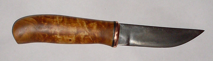 Черная часть - самодельный текстолит(синтетическая лента + эпоксидная смола) медь, кожа, дуб. Длина ножа-165 мм (клинок 75 мм), толщина обуха 5 мм, спуски от обуха-слабовыпуклая линза, вес 120 грамм.