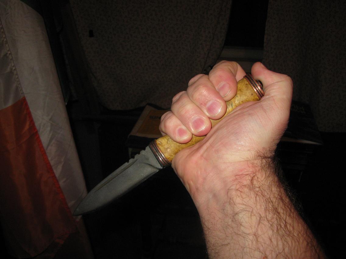 имеет расхождения с классическими шотландскими «скин ду» - они не критичны, а где-то даже удобны, но глаз за них все равно цепляется, в частности мне лишь однажды попалась фотография скин ду с долом на той же стороне, что и у «Эвкалиптового» - обычно дол расположен на другой стороне клинка