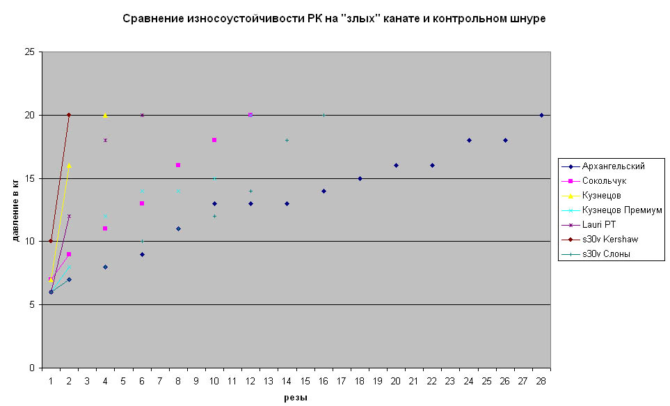 булат - 27 резов,S30V от Слонов - 16 резов в этом тесте и 23 реза в предыдущем,S90V от Спая и Слонов по 20 резов.И только 10V - 36 резов.
