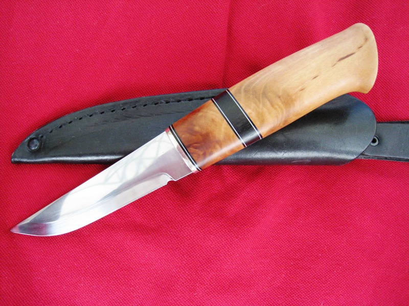 Ну и пожалуй, прежде чем сделать перерыв до завтра, выложу мелкий ножик с клинком от Хелле и рукояткой из кудрявой бубинги и кусочка рога оленя северного. Первый раз я сделал его совсем другим. Но, как начинающий ножедел, слава богу, рукоять сделал толстую (ухватистую :mrgreen: ) - так что, вполне хватило дерева на то, что бы изменить форму рукояти достаточно радикально. Вот каким ножик стал и каким, возможно, останется...
