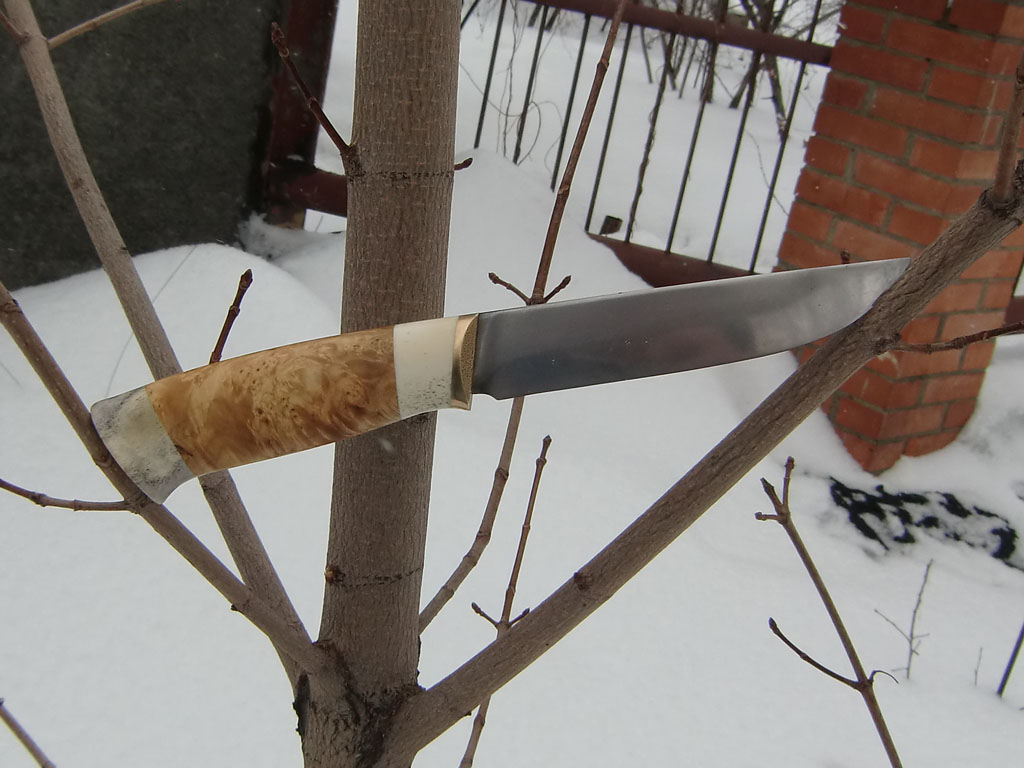 Вообще это мой второй. Ножик делал очень долго, с декабря, не торопясь особо, стремясь скорее не сделать нож, а отработать технику выполнения каждого элемента. Получил и освоил что хотел, не до конца только понял пару моментов - финиш клинка и травление. Как-то оно по-разному все получается, результат трудно предсказуем. Ну да разберемся в дальнейшем, а пока вот что вышло.