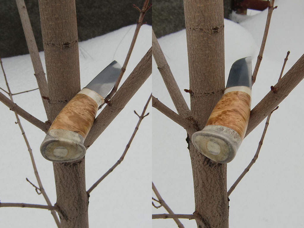 ТТХ: Общая длина 242. Клинок 124х25х3,5. ШХ15, двойной клин, зонная закалка, автор Ниггурат, мной переслесарен с целью приобретения опыта и эксперимента, травлен в хлорном железе. Ручка - подаренная Самоделкиным латунька , рог лося, кап клена от земляка Samosval200. Монтаж сквозной, на гайку грибковую, собран на эпоксидку, пробка тоже из лосика. Пропитан ТикОйл в вакууме, натерт карнаубским воском. Ножны - вороток 4 мм.
