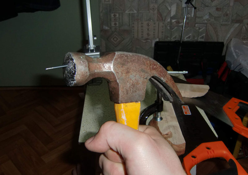 А тут фишка есть - не надо молоточек маленький брать. Я попробовал сначала - им сильно надо бить, чуть отклонился от курса - и либо палец пробил, либо подогнанный больстер запорол. Этот молоток тяжеленький, тюкать можно меееедленно, и точно. Как бы продавливаешь получается сразгона, а не лупишь сразмаху. Если взять молоточек кила в два - наверное еще проще будет.