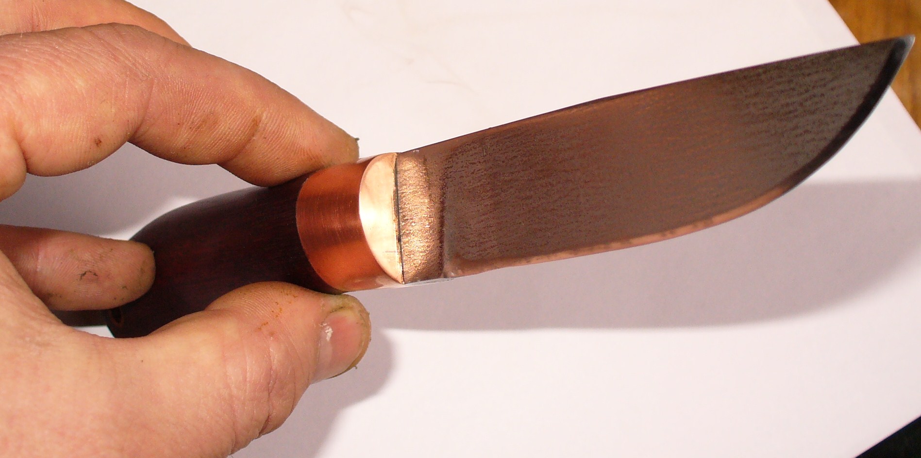 Наконец то я домучал ножик, для себя любимого,клинок уже валялся больше полгода медь(больстер и трубка),амарант,95х18 ковка,без всяких изысков чисто для поработать.клинок 107х3,2х23,рукоять 125,пропитка-льнянка,финиш-шеллак.