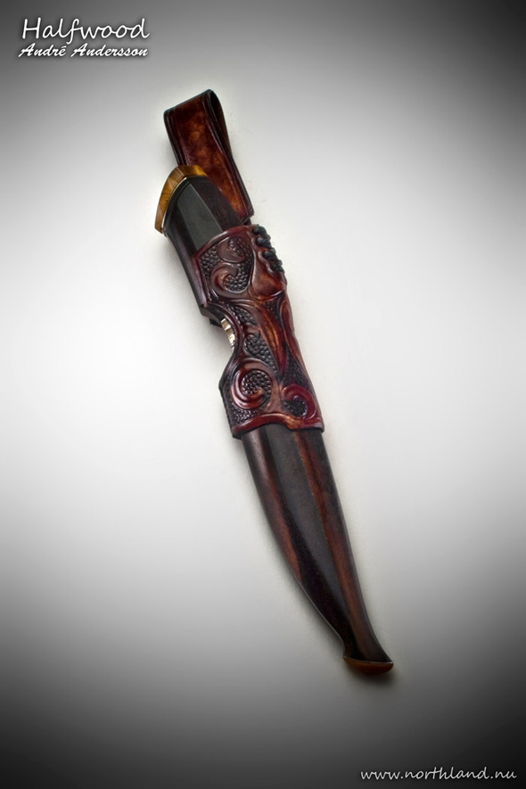 GUARD: : Forged Damascus by Andre Andersson, SHEATH: Custom Wood Lined and Tooled Leather, WEIGHT: 9.3 oz.