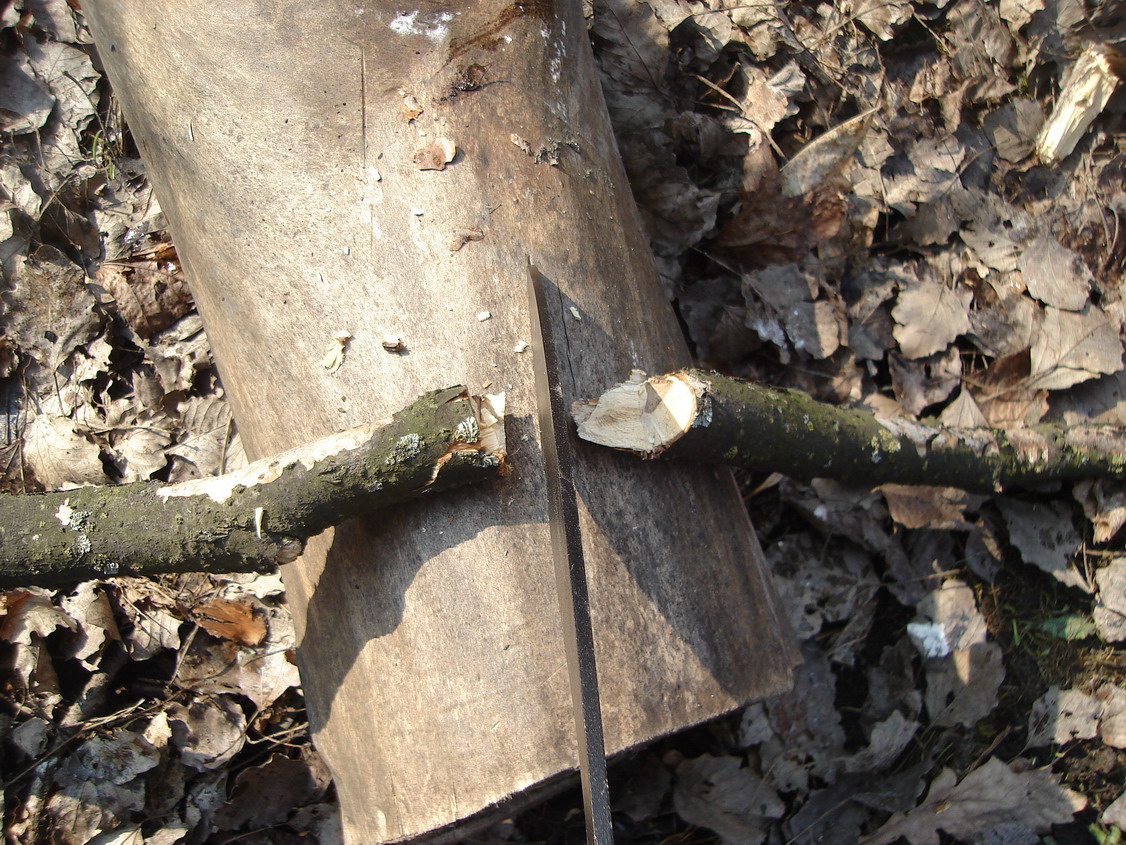 а из кучи я вытащил ветку метра два, толщиной от двух до (примерно) десяти сантиметров. Положив её на пень, приступил.