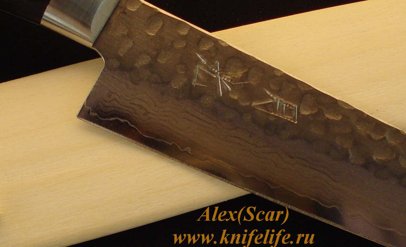Ножи Gekko(guyto, nakiri и petty), VG-10 в обкладках их 16-слойного дамаска со следами кованины. Слайсер - Kasumi VG-10 в обкладках 32-слойный дамаск.