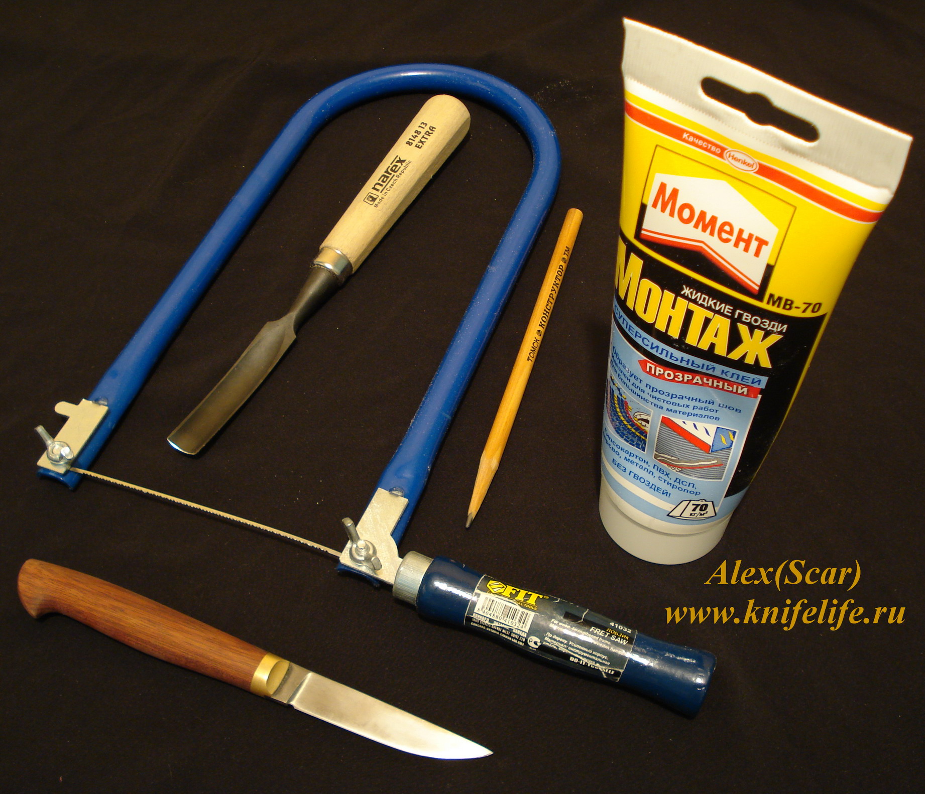 а это все, что понадобилось для изготовления: чешская стамеска(дорогая собака -800р), лобзик, чебурковский маленький дамасковый фикс, карандаш и жидкие гвозди. Осиновые наличники фотать не стал! :lol: