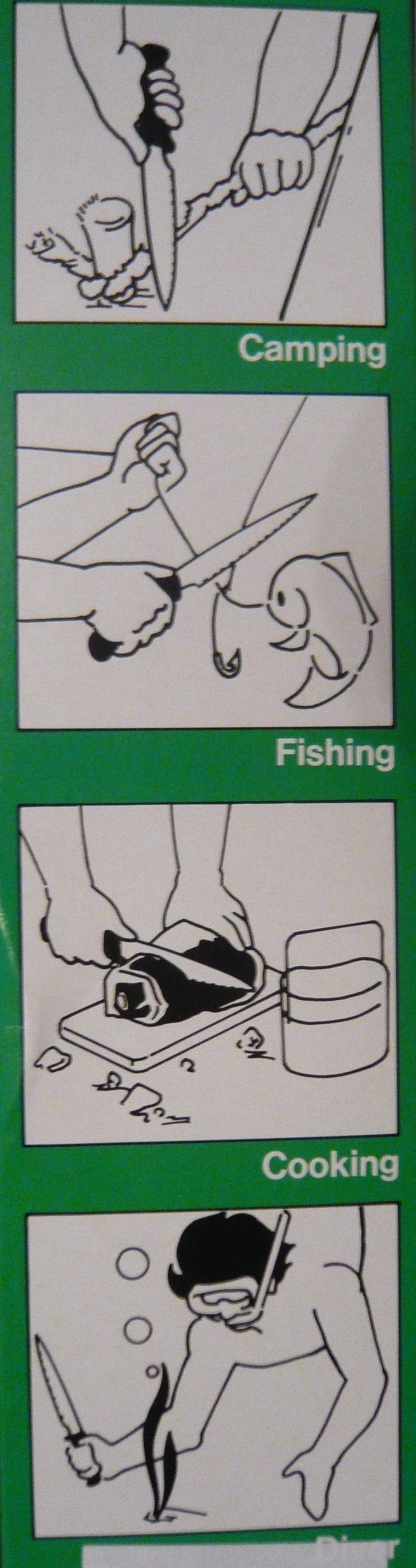 Нож для всего-это нож для ничего.Тоесть по идее это типа ножа выживания много целей,но в каждом отдельном случае никакой.Может это моя придирчивость,но когда я вижу кухонник для дайвинга пробивает на улыбку))