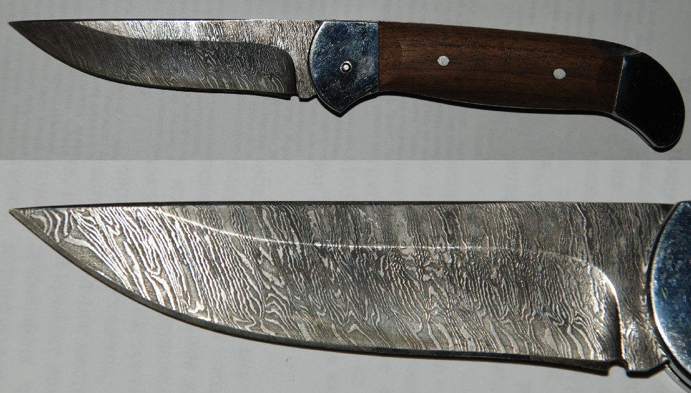 Если нет клейм, то данный складень, скорее всего, кустарного советского производства. Примерно 80 годов прошлого века (ИМХО, разумеется) Дамасск среднего качества. Сборка аккуратная. Мастеру бы я с почтением пожал руку.