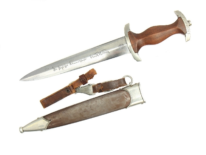 На верхнем снимке - точно, кинжал СС, а вот на нижнем видна только часть клинка и нельзя определить тот же это кинжал или нет. А что до подписи, СС была создана спелиально в противовес СА, набравшей очень большую силу в Рейхе. Врядли руководителю конкурирующей организации позволительно было подписываться на атрибутике СС. Хотя, чёрт их, фашистов, разберёт :mrgreen: !