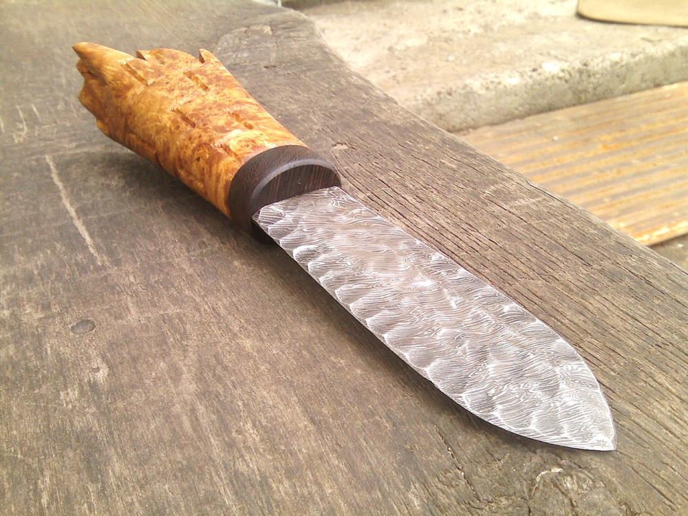 Попробую выставить на обозрение недавнюю работу ,типа древний каменный нож.Клинок и дамаск Мастерской Федотова А.В.,дерево венге и кленовый кап.Размер клинка 130*30*3.5 ,рукоять толстенькая35*25 длиной на 140.Но на мой взгляд размеры могут быть какими угодно на такого типа ножах,и ассиметрия здесь допускается.Он конечно получился несколько весёлым и ярким ,но разве древляне чурались красоты ?