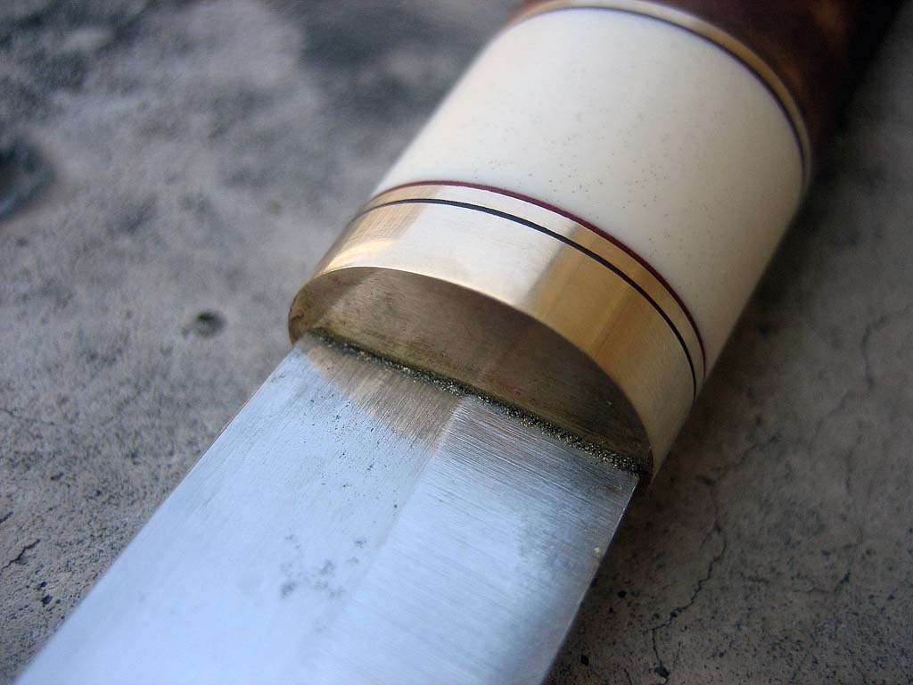 Рукоять пропитать в горячей льнянке, рисунок вытащит и цвет чють уберет(нормализует)ИМХО. По клтинку: Голомень поюзать на кончике клинка до середины выравнять линию спуска (сторона фото №3), для полной пятерки. :wink: