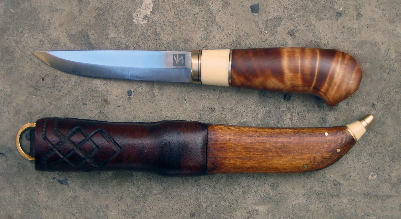 полностью сбил деревяху, поставил новую сувельку ( Илья Ил-80 спасибо! ),собрал ножны. Получилось весьма нетрадиционно, но душа требовала экспериментов. Заклеймил!Сучок получился в этот раз такой как надо - на 100% мужчинский, а не бисексуальный. По поводу формы его могу смело сказать - сучок есть отец всех скандинавских форм рукояти.