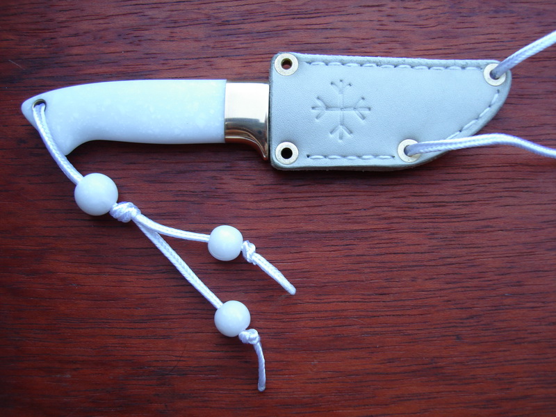 В подарок супруге сделал такой вот нашейный ножичек :) Клинок - "Лаури" из 440с, переточенный в дроппоинт, длина клинка 56 мм, общая длина ножа 125 мм, формы аля Боб Лавлесс, гарда - точеная бронза, рукоятка и бусины - "кориан" от LG, вклейка на бесцветный "Момент супер эпокси", темлячная трубка закреплена развальцовкой, хвостовик на 3/4 в рукоятке...ножны из куска ремня любезно подаренного турком на рынке (найти кожу белого цвета это задачка скажу я вам...)...Каску одел...жду тапок и табуреток :mrgreen: