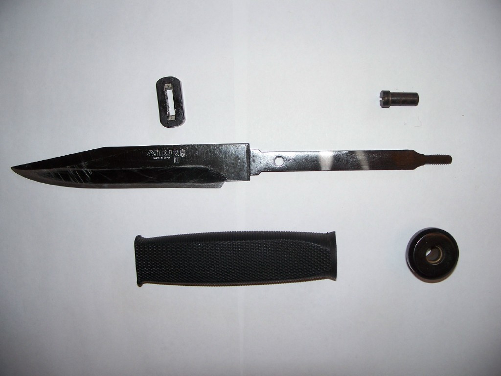 При разборе барахла, брошенного прежним арендатором помещения был найден фиксед. Состояние крайне потрепанное. Часть антибликового покрытия содрана. РК явно перетачивалась, притом крайне не удачно и не равномерно. Но в остальном все вроде бы нормально и поправимо. Правда огорчает, что предыдущий владелец забыл оставить ножны, ну да ладно, найденному коню в зубы не смотрят. После недолгих поисков в гугле, было выяснено, что это Испанский Aitor Ranger http://tesak.net/page/16/. К сожалению, точную марку стали установить не удалось, но по субъективным ощущением, это что то вроде 440A, так как тупится очень быстро, но и правится еще быстрее. К сожалению качества реза, тоже оставляет желать лучшего, но в этом стоит винить переточку, проведенную прошлым владельцем. У самого переточить пока руки не добрались, только немного поправить. Рукоять на ощупь комфортная, рука не скользит, что за материал не знаю, напоминает твердую резину. Хват вполне комфортный. Нож собран довольно добротно, вся конструкция легко разбирается, для этого достаточно отвинтить только один винт. Толщина обуха 3.3 мм.