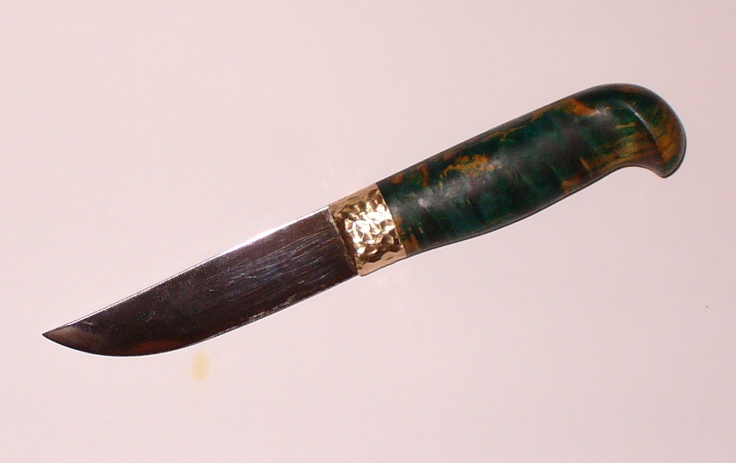 Клинок совковой поковки из клапана каковато, латунь больстер, и карелская бэрёза.