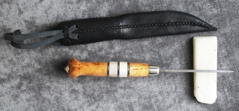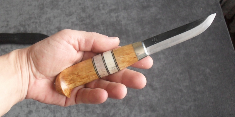 Рукоять- карелка, нейзильбер, рог лося, кожа. Монтаж на эпоксу сквозной с расклёпом . Пропитка маслом для полков и с-шеллак. размеры 115х31х23