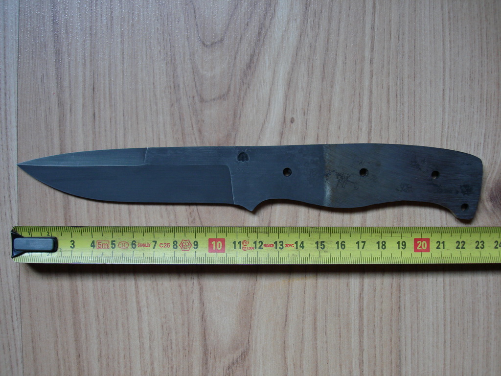 В общем получил на почте клинок и.... наверное отправлю его обратно. После клинка от Бирюкова испытал легкое замешательство от качества исполнения, в общем на фото все видно, клинок не в финише (хотябы промежутночном), не заточен, спуски выведены неравномерно, особенно на фальшлезвии, сведение основного 0,7-0,8, фальшклина - 1,2 мм, спуски фальшлезвия смещены от оси обуха. Рукоятка обточена неравномерно и утолщение ее смещено к кончику, рукоять слегка (на 1-1,5см) длинне чем требуется моей, кстати не мелкой руке, вобще же нож скорее всего получится не ножом а как это модно говорить "ломиком", поскольку при толщине обуха в 4,5 мм весу в нем грмм 300 и это без накладок. Есть правда "отметины" на обухе от измерителя твердости....написано что 59...в общем эхххх....если не прав то поправьте.