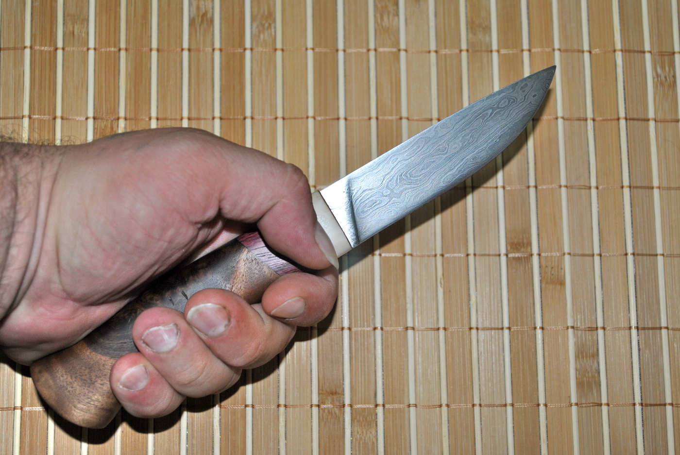Больстер лосик ( И не говорите что он не прочный. Старый, тоже из лосика, еле разбил зубилом...), амарант и какойто кап (похоже орех) от ДД. И перешил ножны. Старые из капа клена не смотрелись с капом ореха.