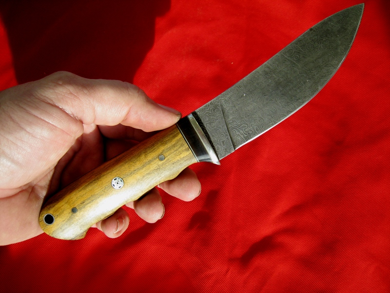 Несколько лет назад, может года три, купил я по-случаю клинок пакистанского дамаска - у Hunt11 на Ганзе. Со временем мое отношение к нему изменилось, рассматривал я его с некоторым недоумением, прикидывал, можно ли из него вообще что-либо путное сделать - не понятен мне был полет фантазии пакистанского кузнеца. А недавно смотрю в одной из клижек - о, он! И написано, Билл, типа, наш Моран, нож General Yeager Hunter-Skinner... Похож, понимаешь! Ну, значит, если это с Билла Морана содрано, то это не нож плохой, это я глупый. Ну и сделал его как он есть - руководствуясь клинком и картинкой из клижки. С небольшой поправкой на другие материалы. :wink: