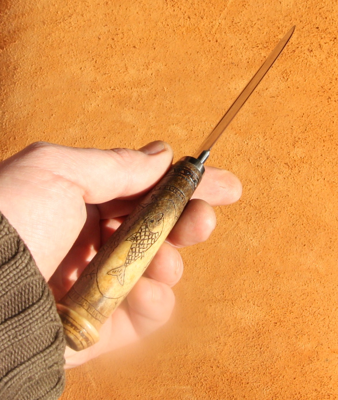 Понравился. Тока долы не мои. А насчет рукояти вспомнилась финочка с варганной найфовки от Андрея ака Самосвал, он тонировал кость слабым раствором зеленки. Офигенно смотрится. Был поражен. Прожилочки чуть потемнее, остальное посветлее, почти, как на малахите узор проявился