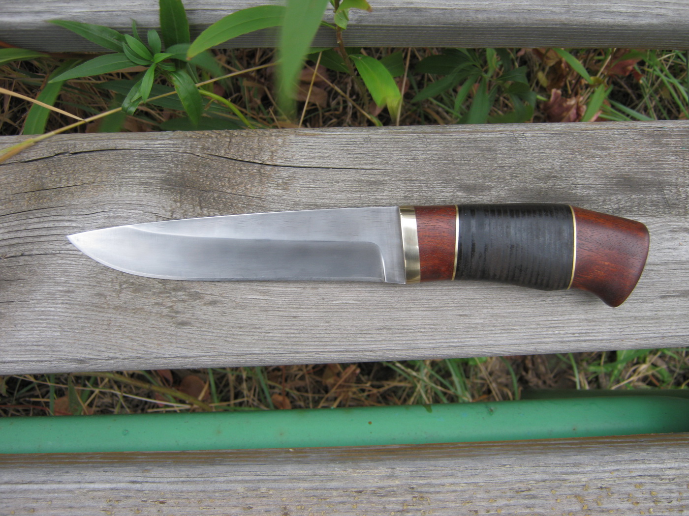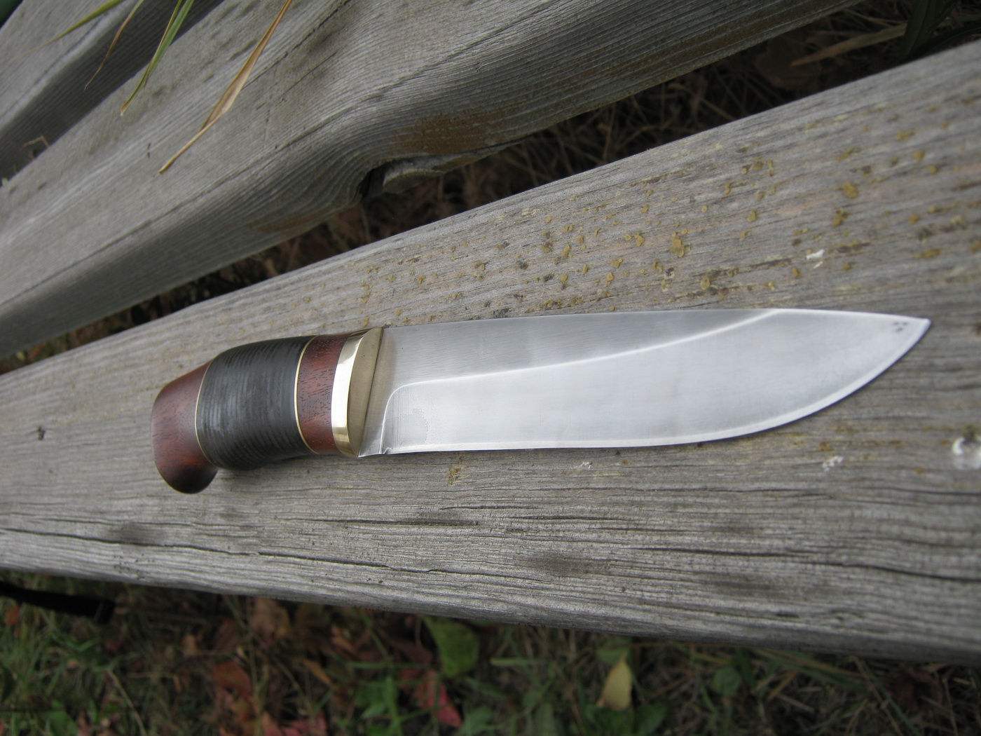 Нормалный ножик....тока плашущие латуневые простафки, как то не фонтан...В данном случае паралельность сыгралабы более благоприятно, честно говоря....потом, клинок длинный 150мм, рукоять коротковата 115, пропорции визуально имеют значение, тем паче при наклонных, сведённых внутрь нижних точках, больстера и тыльника...Вот Толик, ты померь по нижним точкам, там наверное уже 90-95мм получится, к чему это я, а вот к чему, тут смело можно было делать 130мм, а то и 135....