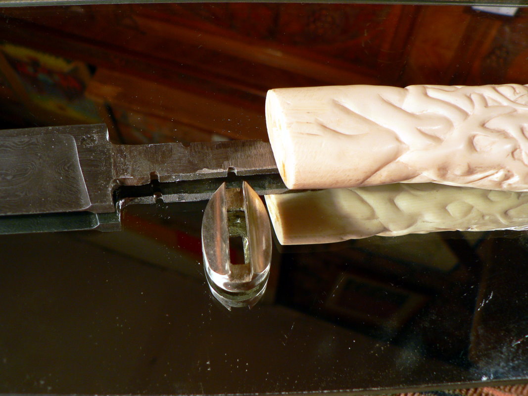 Хочу добавить,что Ваши работы по мамонту достойны восхищения ИМХО,но этот нож как-то не очень,резьба не чёткая,а наковырянная какая-то,уж извините,а если не только на простаке её сделать или покрыть проставку полностью в стиле,то получится отлично,с уважением.