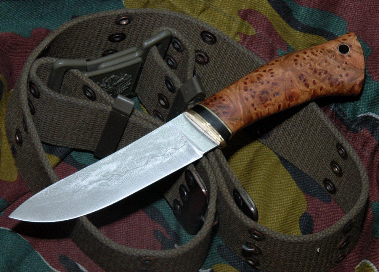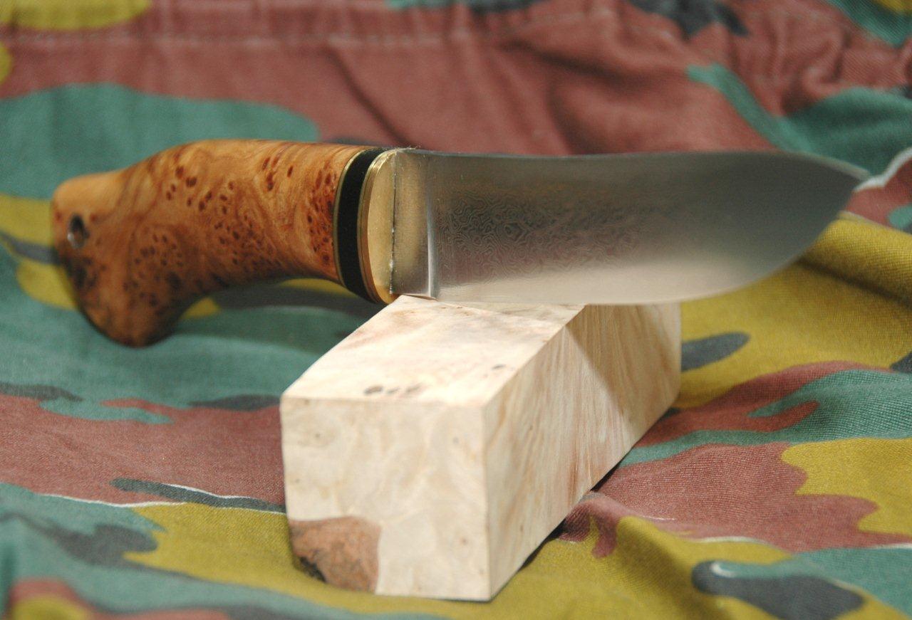 На этой неделе образовался еще один нож. Клинок сделан был давно, из "дикого" дамаска мастерской "Булатград", поковка была куплена другом на "Клинке" два года назад. На рукоять пошел кап карагача и чуть- чуть блеквуда. Общие размеры: 250мм, длина клинка: 130мм, толщ. 3,5 мм, ширина 28мм, сведен от обуха на клин с подводом 0,2мм, закален и отпущен на твердость 57-58 HRC. Сам нож практически готов- надо рукоять шеллаком покрыть и подчистить латунные проставки. Ножны пошью к концу недели, фото будут :) Буду рад выслушать замечания, может быть, еще что то можно подправить.