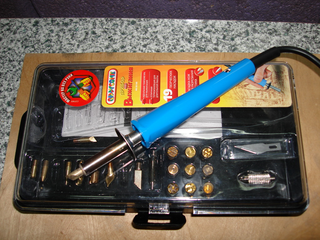 Да, может баян, а может и нет: купил недавно в магазине игрушек :D вот такой прибор для выжигания (еще и резки, и пайки :) ) http://avnv.ru/internetmagazin?mode=pro ... _id=224083 , интересные узоры им можно делать, у нас правда стоит 1000 рюбь но куда деваться :D .