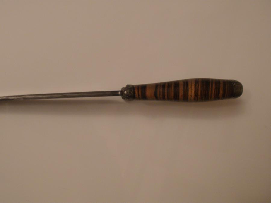 Действительно холодный,но если он кому-то вдруг понадобится,то нарисует на нём номер и фсё-пользуйся безбоязненно.А то что зебранка мрачновато смотрится-есть немного,потемнела после пропитки расплавленным парафином.На мой взгляд не катастрофично.Зебрано была выбрана из-за своих полосок,чтоб по возможности сочетался рисунок на клинке и тыльнике с рукоятью.