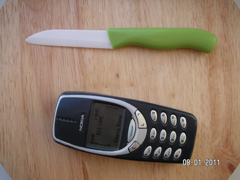 Так и предполагал изначально. Это распространенная дешевая уловка для некачественных ножей. На саму режущую кромку тончайшим слоем наносят напыление на основе алмазной крошки или каких-либо металлов, чтобы нож мог резать. И тут не важно из чего сделан сам клинок - из керамики или из пластмассы. Так что в данном случае все эти сказки про оксиды циркония - лишь очередная фигня на постном масле. Уж лучше тогда из стали ножи делать с таким же напылением, тогда ножи хоть раскалываться не будут.