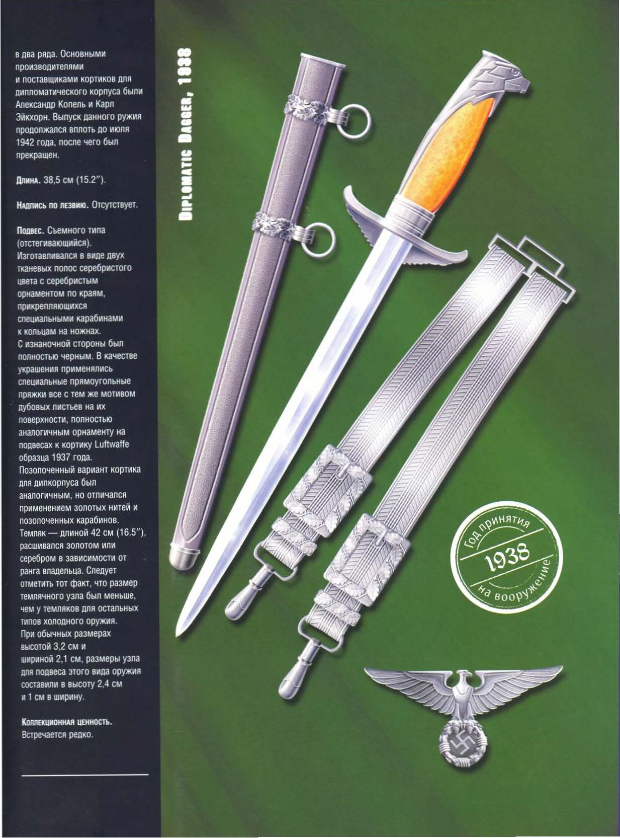 Кортик дипломатического ведомства. Кортик был утверждён Гитлером в качестве аксесуара к новой униформе дипломатов в мае 1938года. общая длина кортика составляет 39 см. На лицевой стороне перекркстья находится имперский орёл со свастикой в венке. Навершие рукояти также сделано в виде орлиной головы, а боковые накладки изготовлены из перламутра, который с течением времени принимал жёлто-оранжевый оттенок.