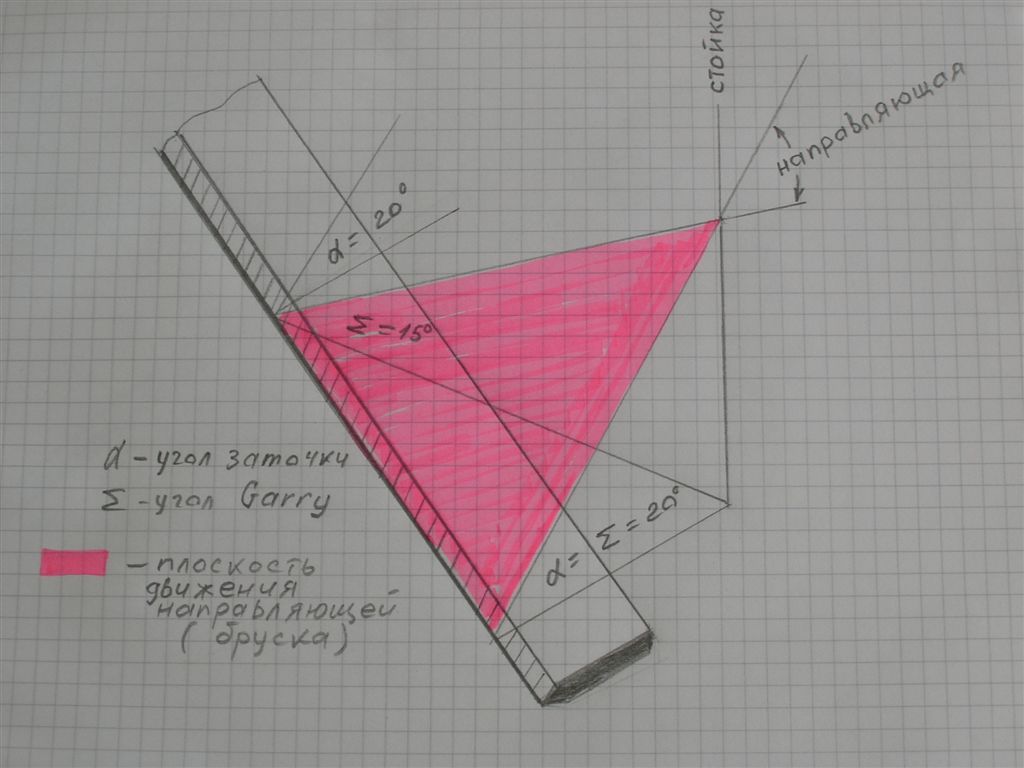 Плоскость бруска параллельна плоскости обложки в примере с книгой. Направление хода-подачи бруска тут вообще не причем. Вы упорно, даже на примерах Аркадия, прозрачных, как горный ручей, не видите простой вещи: мы говорим о разных углах. Вы - об угле сигма, он же угол Garry (см. картинку Аркадия). Это угол между направляющей бруска и плоскостью клинка. Этот угол изменяется. Но он не имеет отношения к углу заточки.